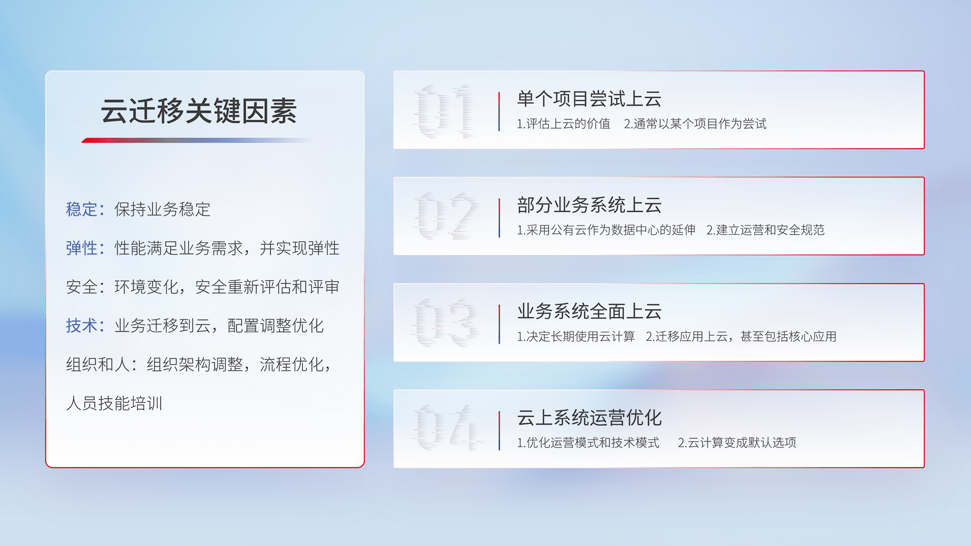 结合实际业务,,从规划设计、、、云平台选型、、、云原生改造、、、数据迁移、、、、集成交付,,迁移全过程为客户识别最佳上云路径,,,,做好风险识别管理,,,设计网络架构、、身份权限、、安全审计合规、、、、操作审计、、、日志审计、、监控告警策略、、多站点容灾设计等,,,对云上基础设施进行整体规划,,,,提升IT治理水平,,,,以满足弹性、、、高可用、、、、高性能的需求。。