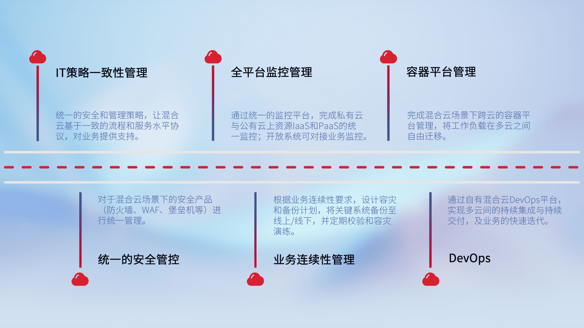 通过多云纳管,,,以统一的资源数据模型把客户的云资源进行抽象和封装,,进而实现对多云资源的统一操作,,保障云资源管理的可靠性、、、稳定性与可用性。。。量身定制化运维内容,,,,配置、、、、开发运维、、补丁管理、、、备份、、、、监控、、、、认证和访问管理、、、、审计和日常巡检等,,保障在用云过程中的可靠度,,稳定度以及高可用率。。。。