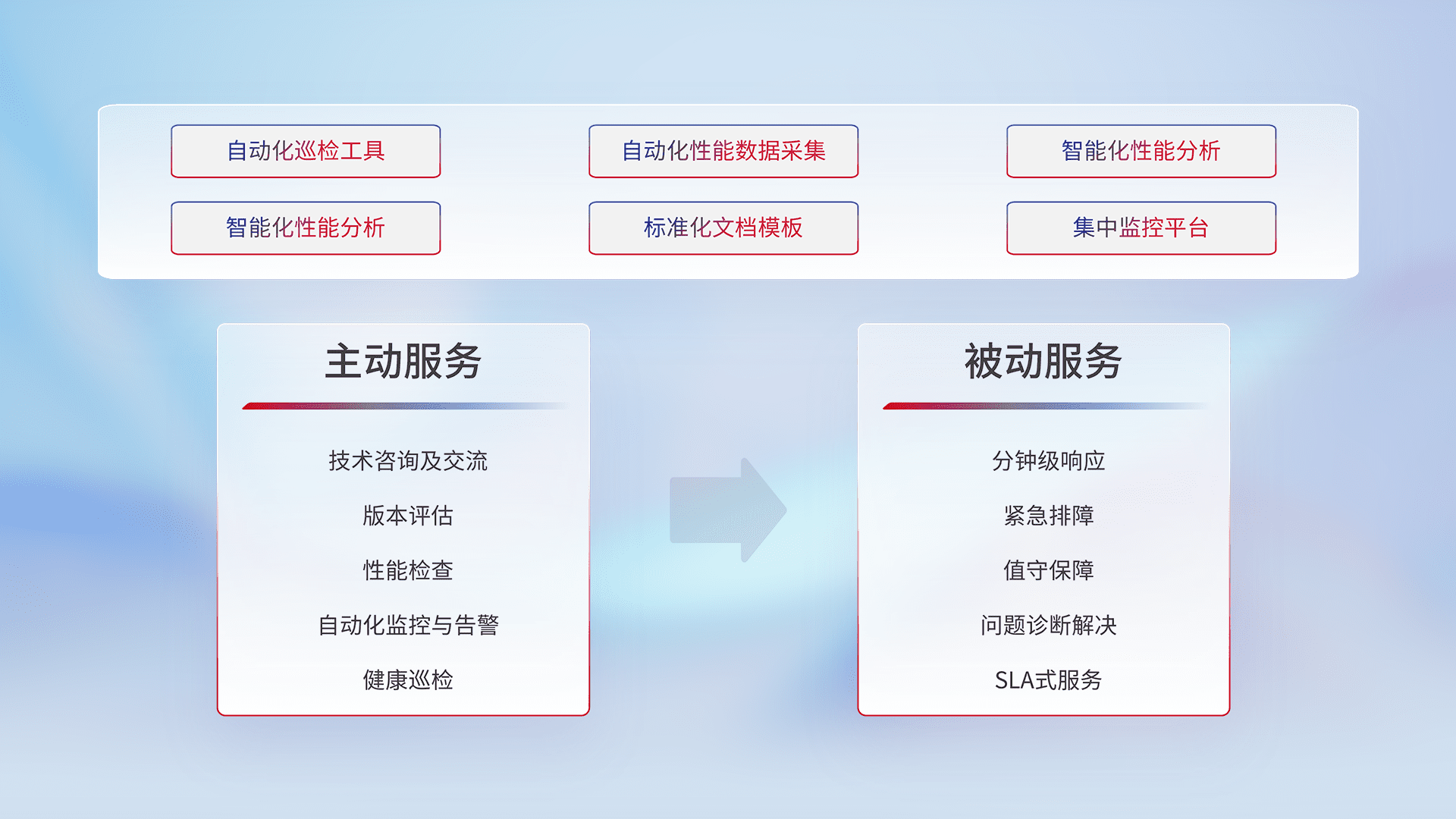 智能化工具和标准化文档,,保障服务质量,,提供主动服务(包含技术咨询、、、、版本评估、、、、性能检查、、自动化监控与告警、、健康巡检)和被动服务包含(分钟级响应、、、、紧急排障、、、、值守保障、、、问题诊断解决、、、、SLA服务)。。。。